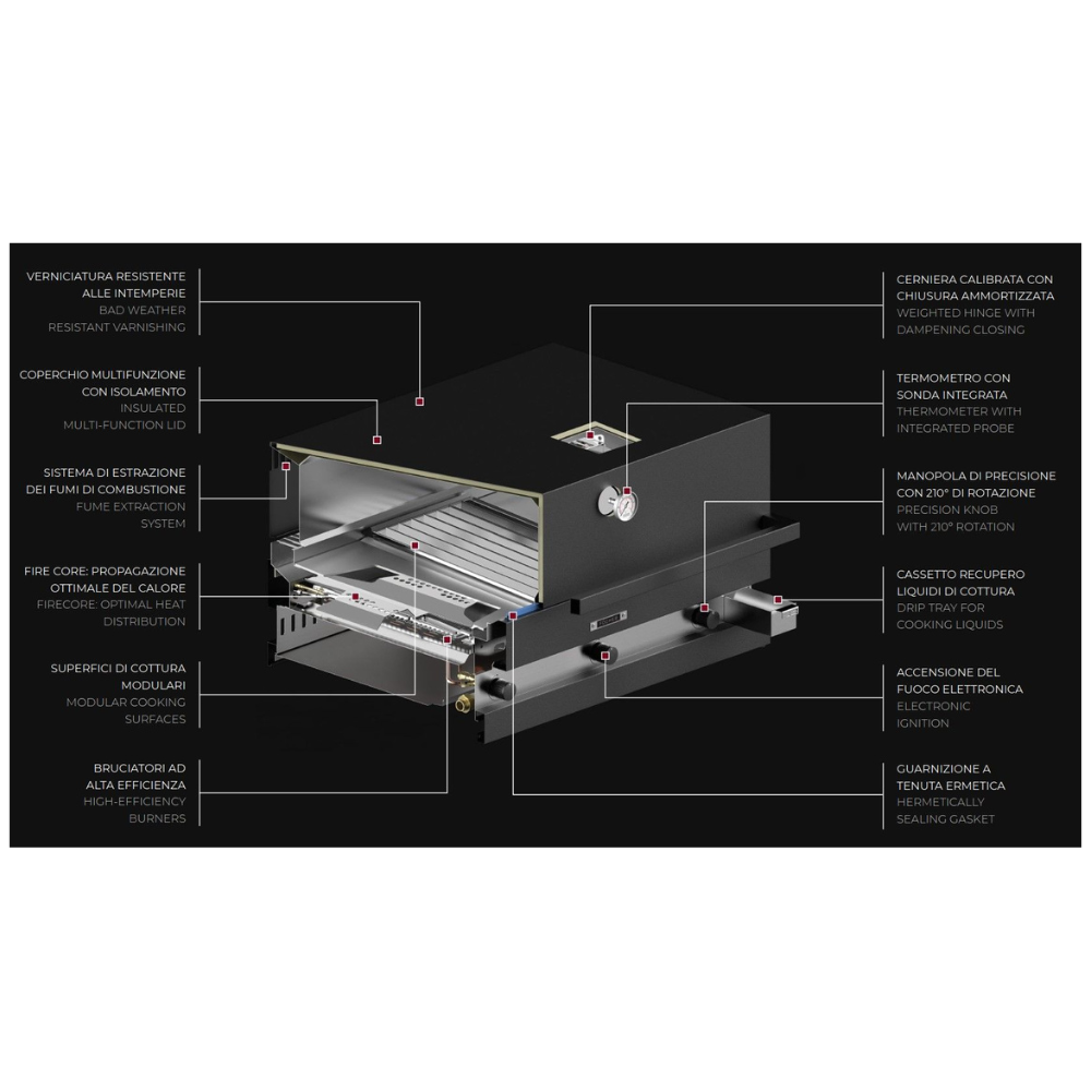 Il coperchio con vetro integrato permette un controllo visivo della cottura, mentre il sistema brevettato di combustione garantisce efficienza e consumi contenuti. Il piano in acciaio inox AISI 304 e le finiture impeccabili lo rendono un elemento di pregio in qualsiasi contesto outdoor.