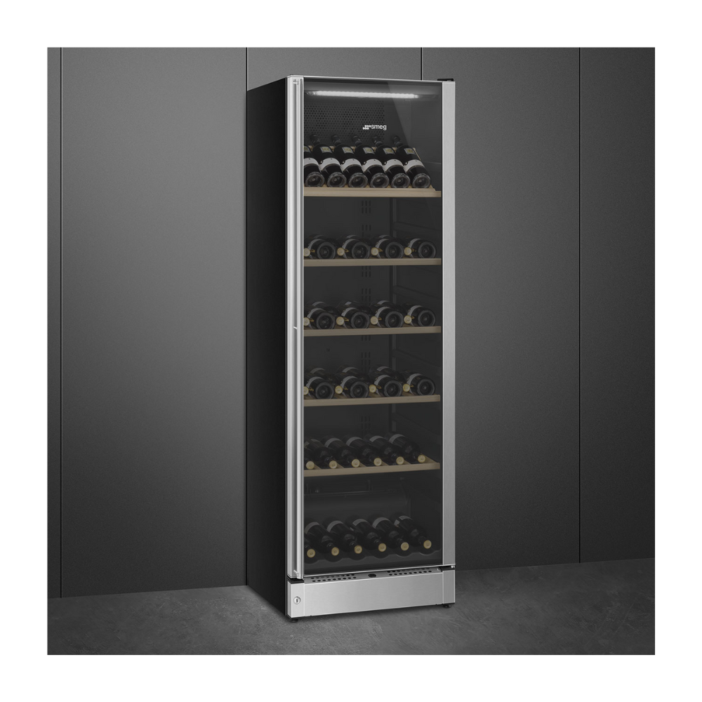 La cantina vino SMEG SCV115G offre una capacità di 368 litri, ospitando fino a 197 bottiglie. Grazie alla doppia zona di temperatura, puoi conservare separatamente vini rossi e bianchi alle condizioni ottimali. Il compressore a basse vibrazioni e il filtro a carbone attivo assicurano un microclima stabile e privo di odori indesiderati, mentre l’illuminazione LED e i ripiani regolabili in legno rendono la gestione e l’esposizione dei vini semplice ed elegante.