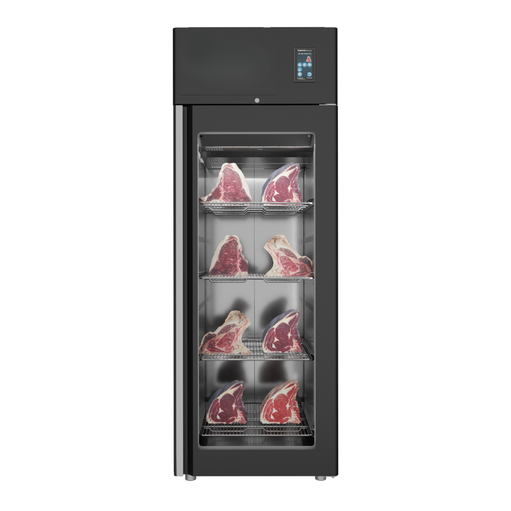 Fleischreifeschrank für alle, die professionelle Leistung und einen einzigartigen Stil suchen. Struktur aus schwarzem Kunststoffblech, Glastür, 4 Einlegeböden, doppeltes HACCP: Qualität, Sicherheit und Design in einem einzigen Produkt.