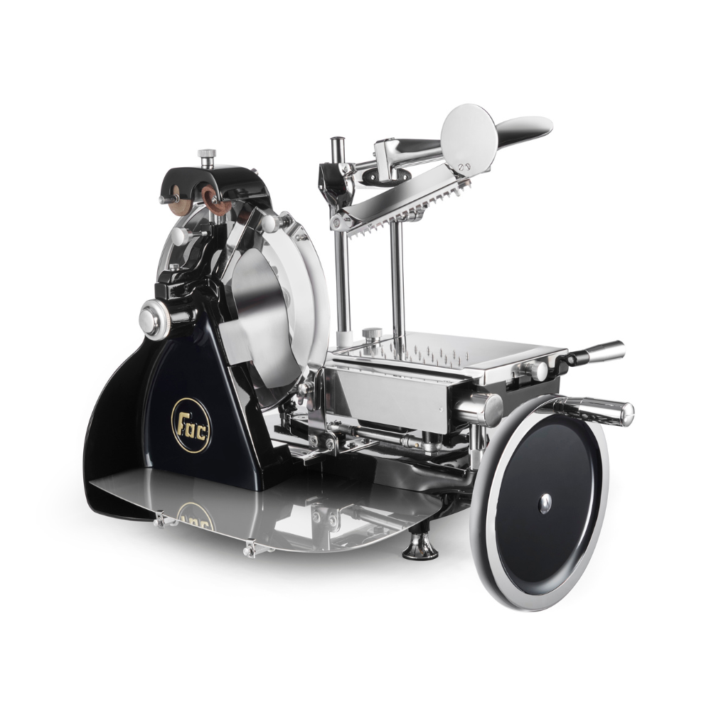 The Black version of the Fac Flywheel Slicer model 250 is designed for those who want to combine professional cutting performance with a refined and modern aesthetic. The manual flywheel operation allows total control over the thickness of the slices, preserving the quality and flavor of the cured meats. Thanks to the resistant materials, the integrated sharpener and easy sanitization, it is a reliable and long-lasting tool. Perfect for high-level commercial activities or for those who love to stand out even at home with a unique piece of design.